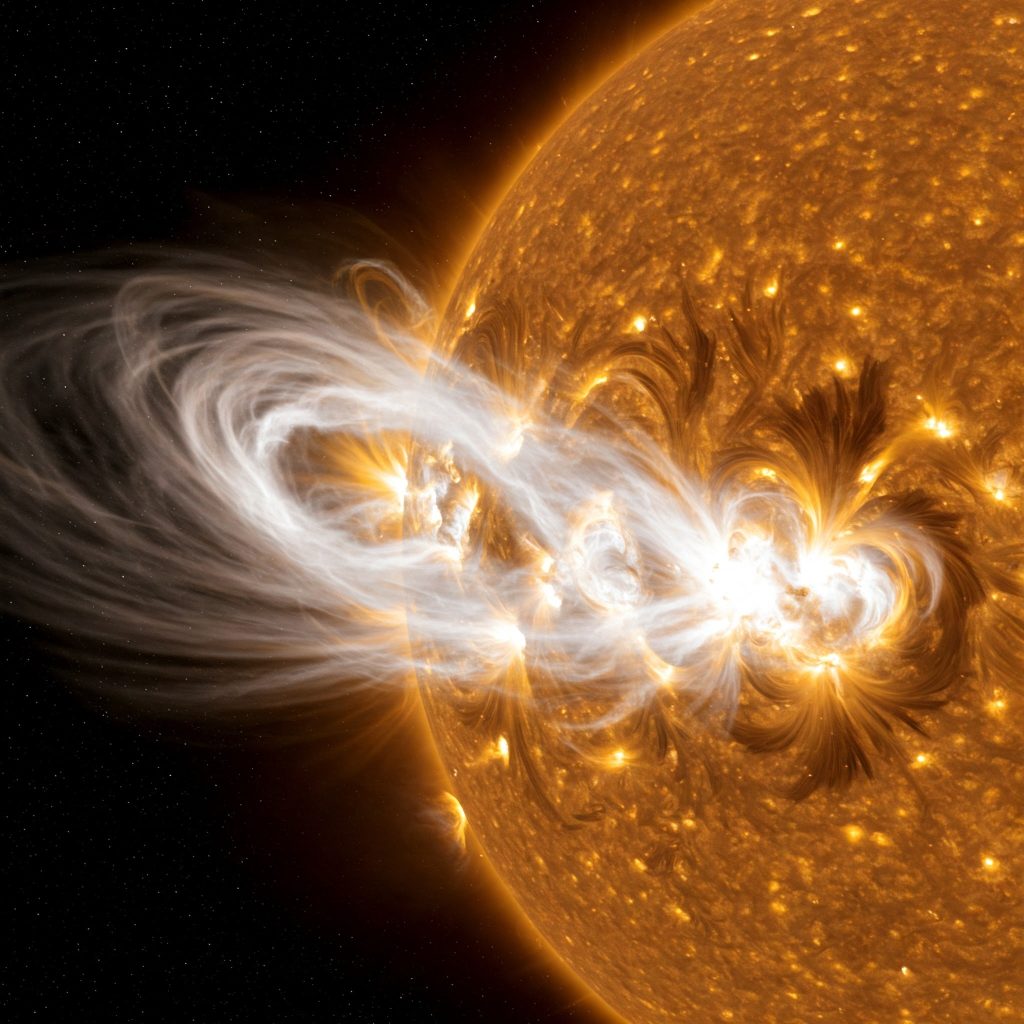 Oprócz ciągłego wiatru słonecznego, Słońce okresowo emituje znacznie większe i gwałtowniejsze porcje plazmy i pola magnetycznego, zwane koronalnymi wyrzutami masy (CME). Te potężne erupcje mogą zawierać miliardy ton materii i poruszać się w przestrzeni kosmicznej z prędkościami od kilkuset do kilku tysięcy kilometrów na sekundę.
