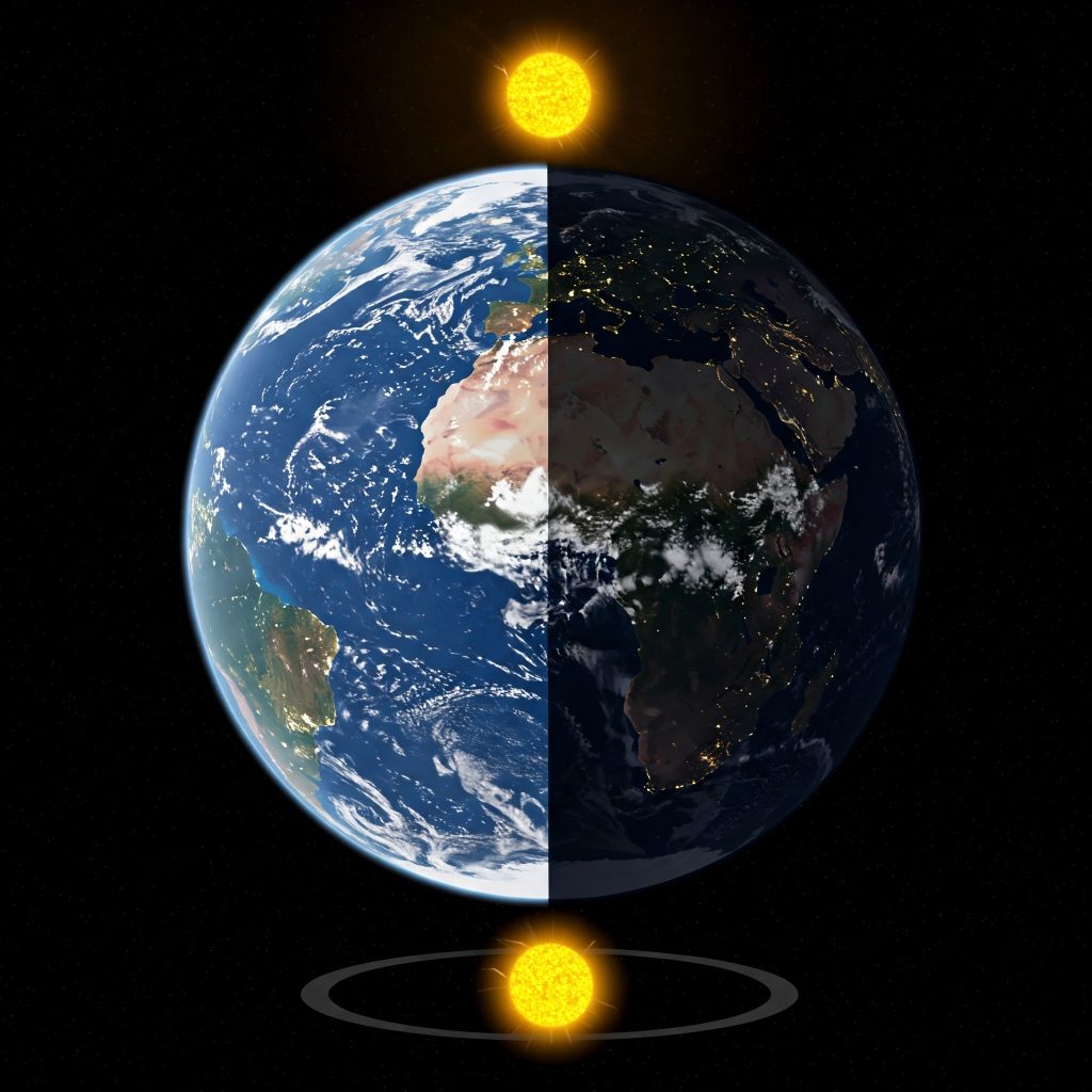 - Starożytność: Wierzono, że Ziemia jest płaska i znajduje się w centrum wszechświata, a Słońce krąży wokół niej. Noc tłumaczono tym, że Słońce chowa się za górami lub pod ziemią.